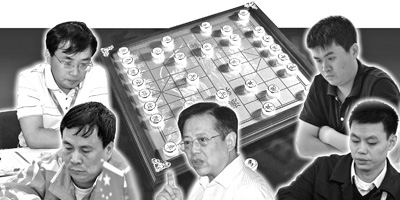 图为棋手:孙勇征(左上)、王天一(右上)、吕钦(左下)、胡荣华(下中)、许银川(右下)。 |