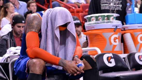 安东尼在与热火比赛进行到第四节还剩7分30秒的时候完成了一次高难度的跳步后仰投篮,但是这次投篮迫使安东尼的左膝承受了较大的压力,完成此次投篮之后安东尼一瘸一拐地回到了更衣室。